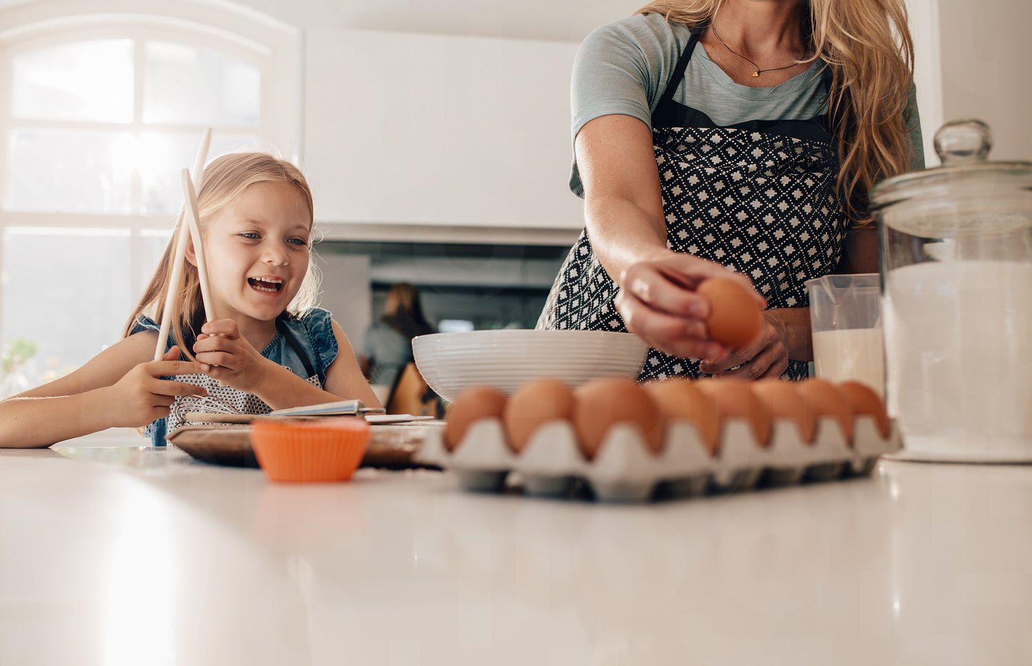 Little girl standing in kitchen with mother baking. Woman picking egg and daughter standing by smiling.