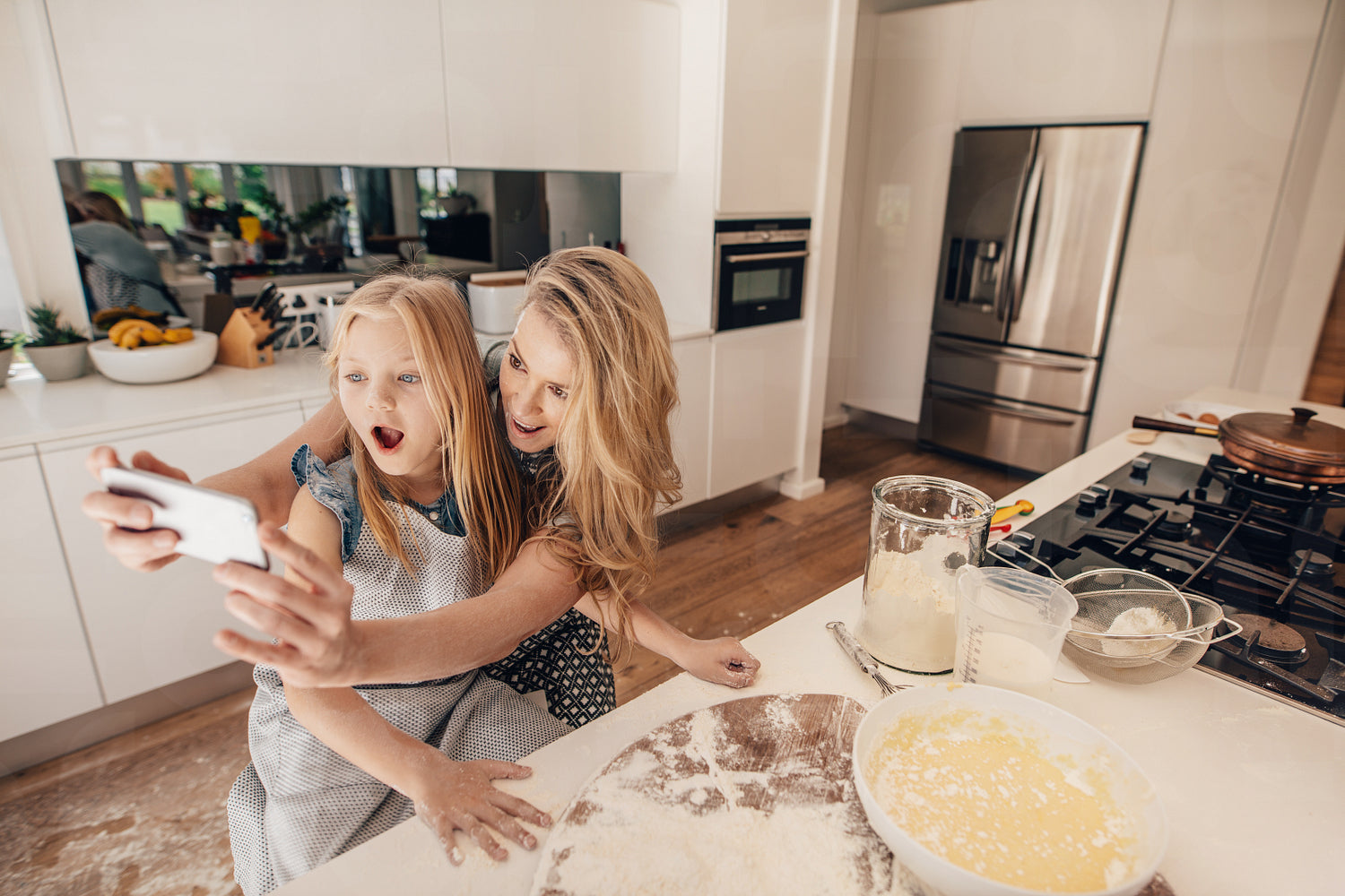 Happy young mother taking selfie with her daughter in kitchen. Young woman and little girl making food in kitchen taking self portrait with mobile phone.