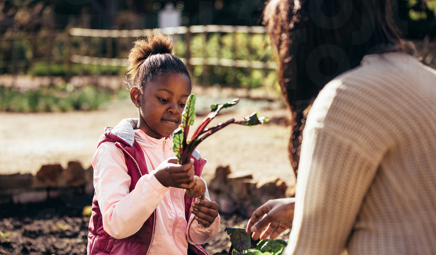 Little girl holding a vegetable outdoors with her mother. Daughter holding young beetroot plant with mother in the farm. Little girl helping her mother in the garden.