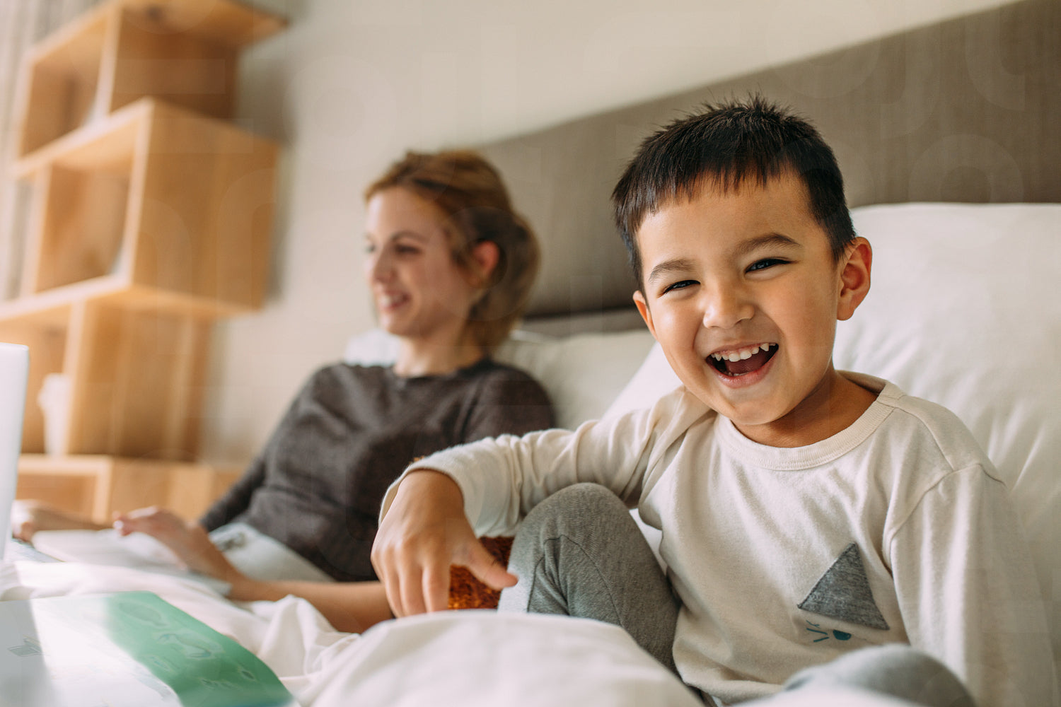 Cute little boy sitting on bed and smiling with her mother working on laptop at back. Son laughing on bed with woman sitting besides using laptop.