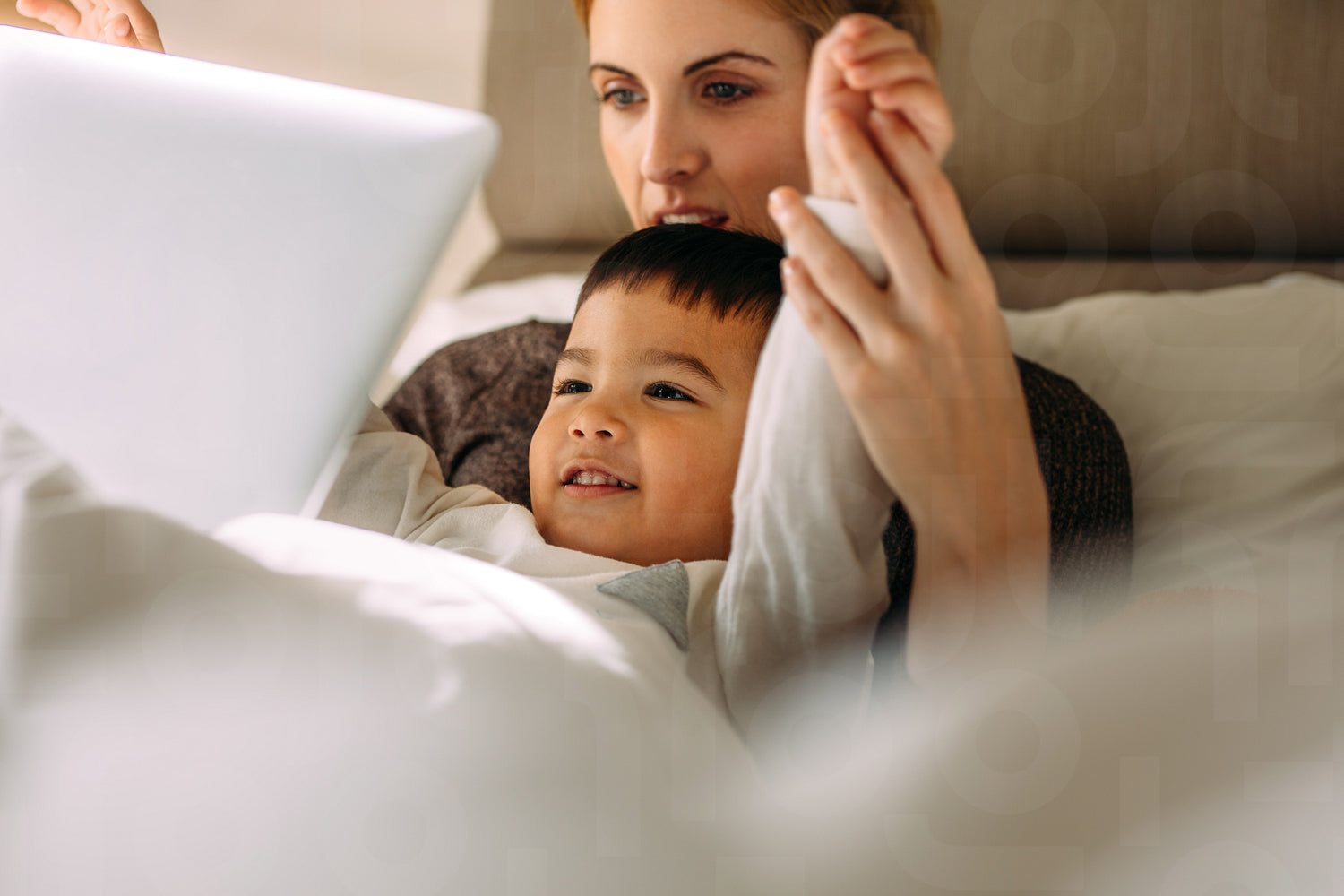 Little boy with mother enjoying watching cartoon movie on laptop while lying in bed. Young woman with her son looking at laptop with her hands raised.