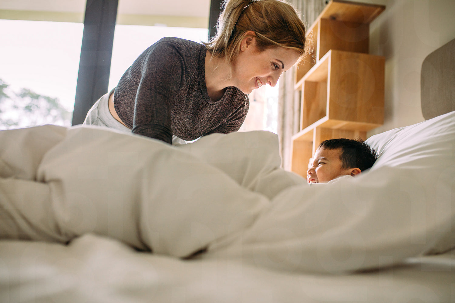 Young mother and her son playing together on the bed at home. Woman having fun with her son at home.