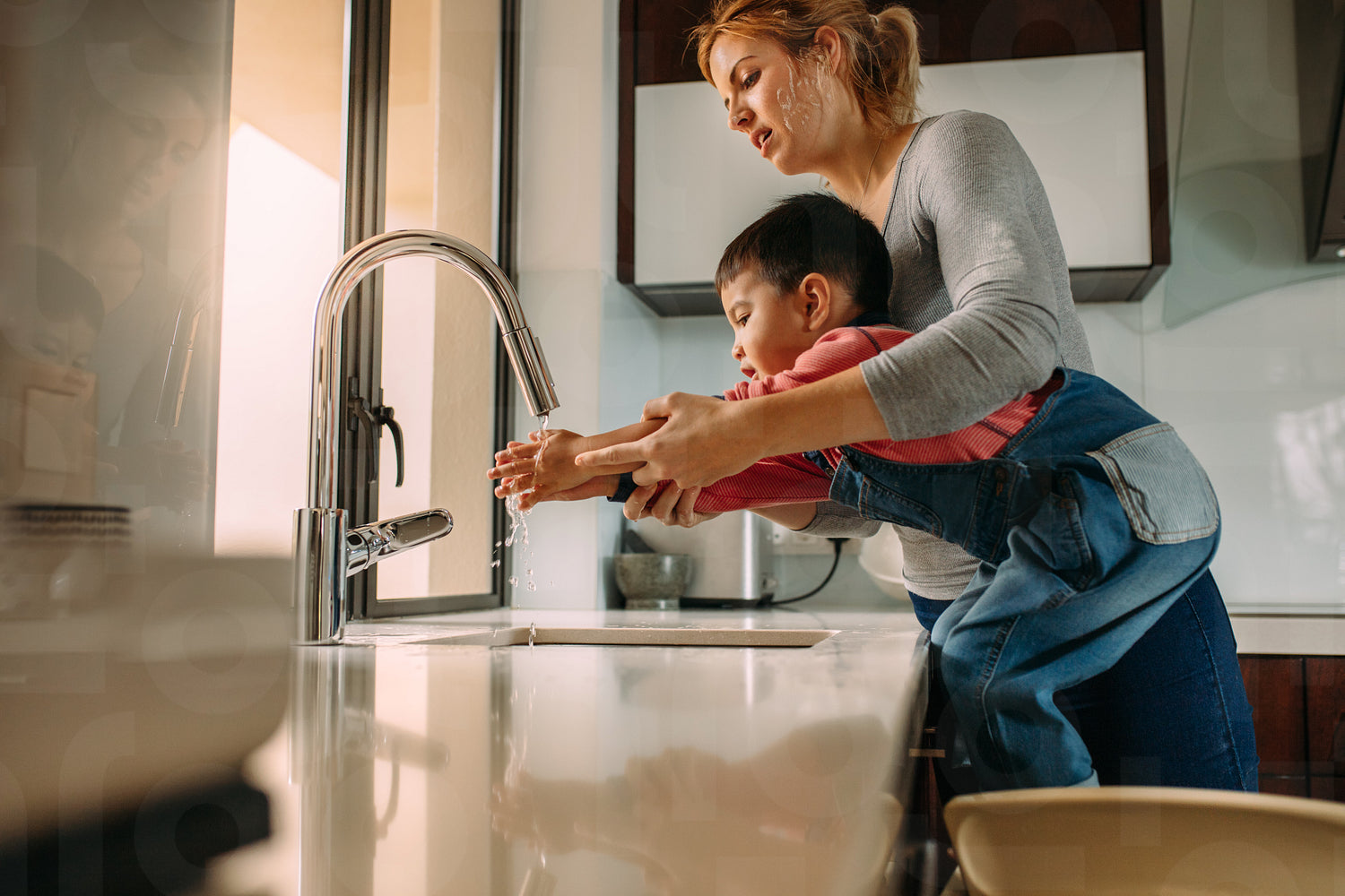 Cute son washing hands with mother in the sink after cooking. Woman helping little boy to wash hands at kitchen sink.