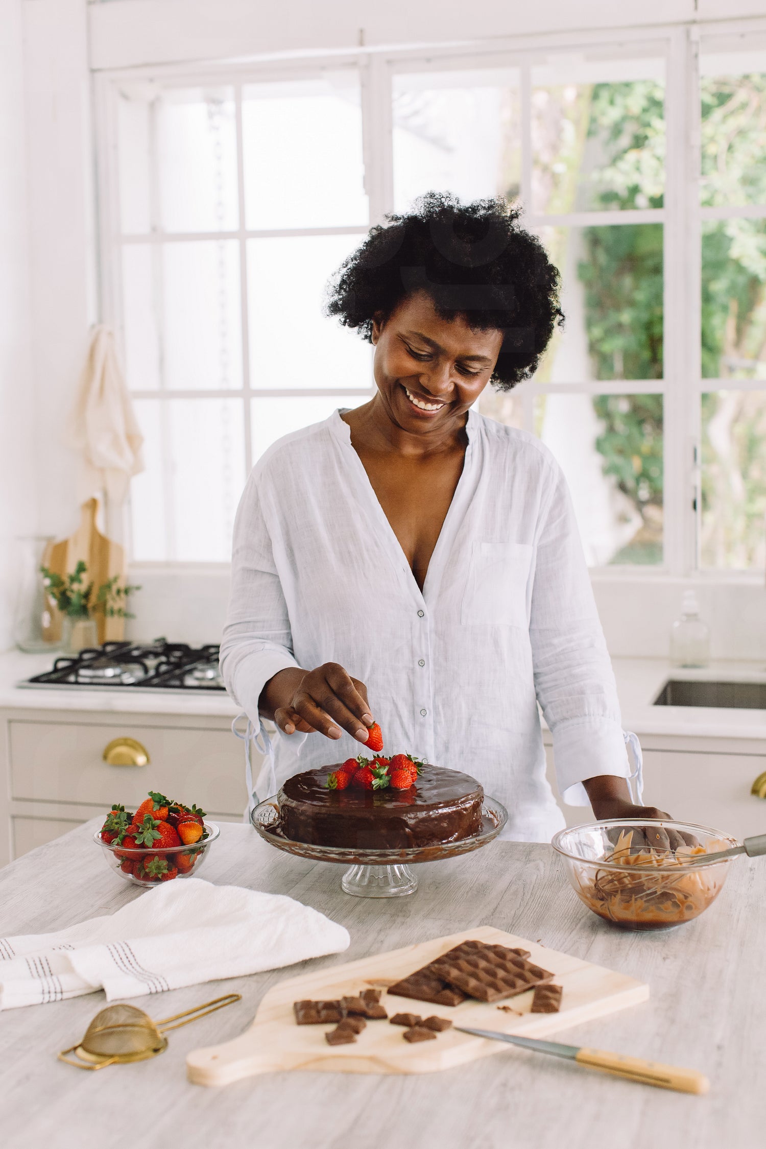 Mature african woman placing strawberries on freshly made chocolate cake. Entrepreneur at home.