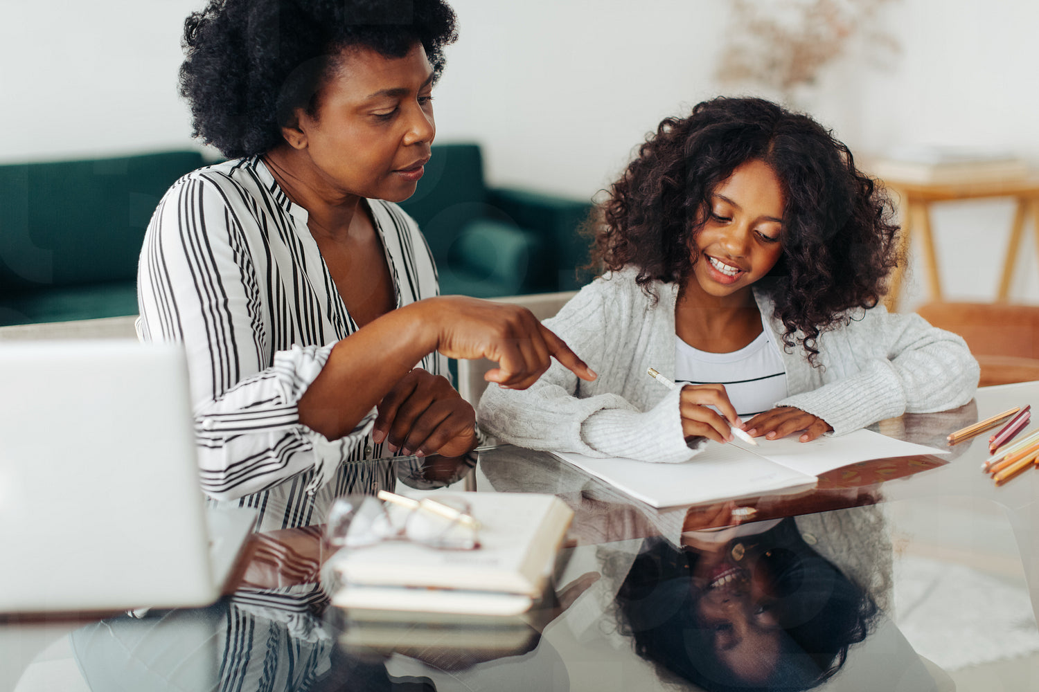 Mature woman helping daughter in her homework. Mother homeschooling her daughter