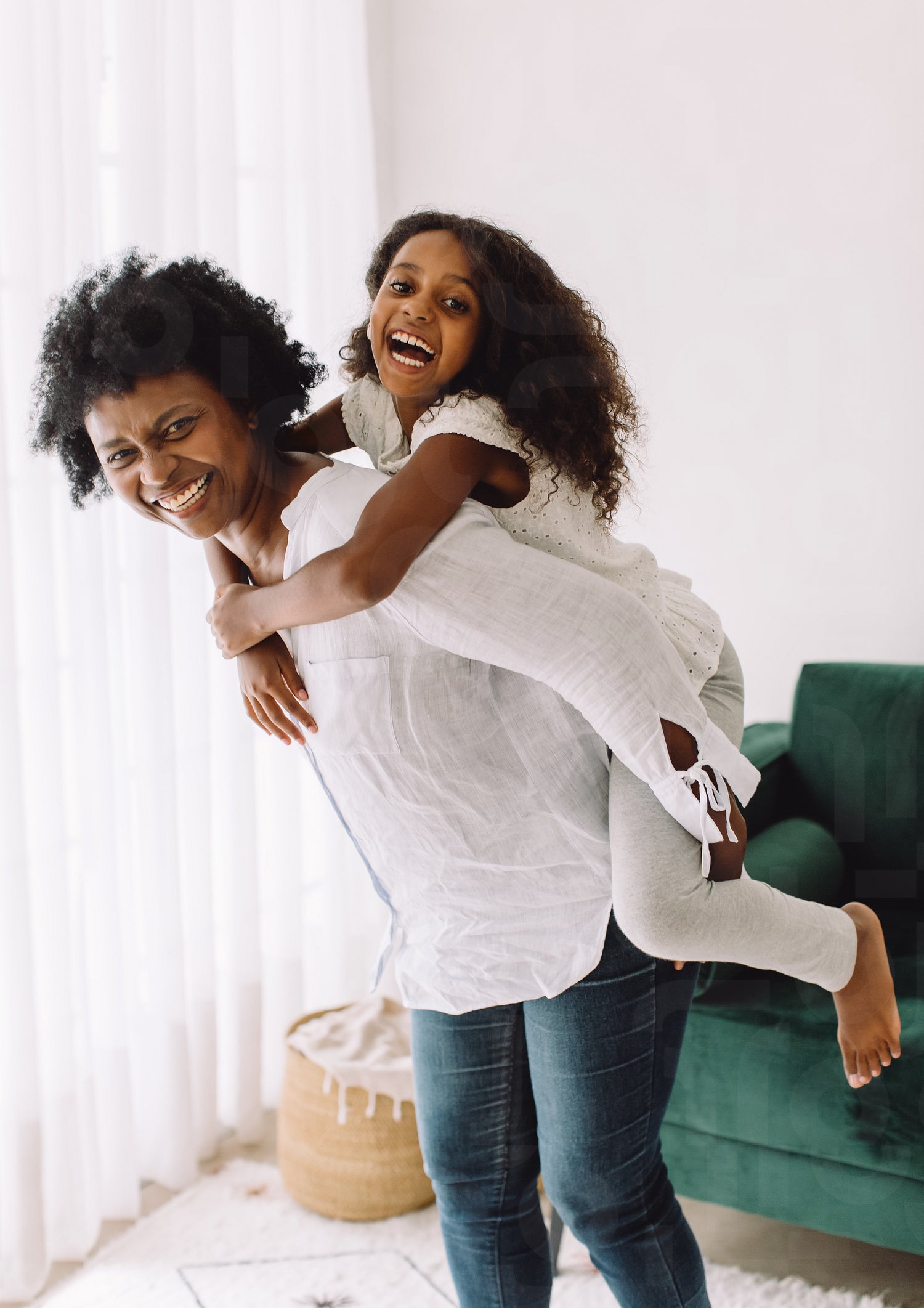 Senior woman piggybacking her granddaughter. Female carrying her grandchild on her back and smiling at home.