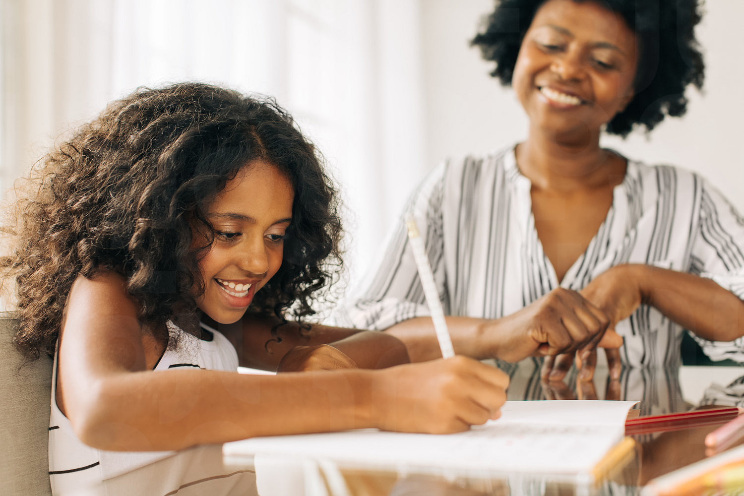 Girl writing her homework while grandmother observes. Small girl doing homework with grandma sitting by