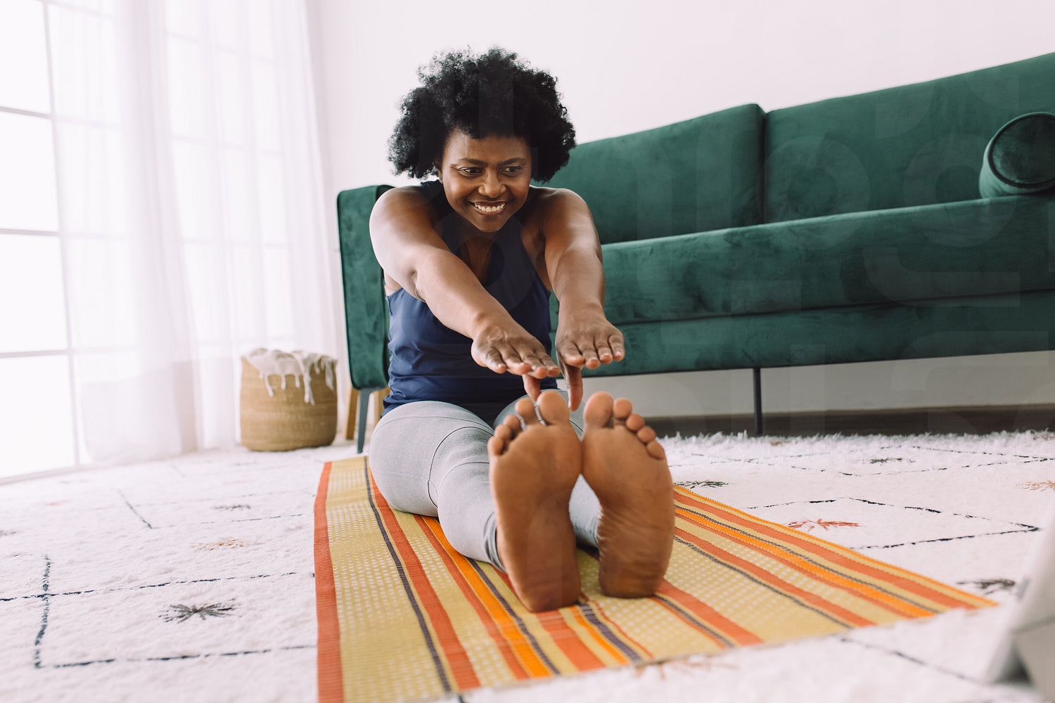 Mature young woman doing yoga exercises at home. African woman practicing yoga at home on mat.