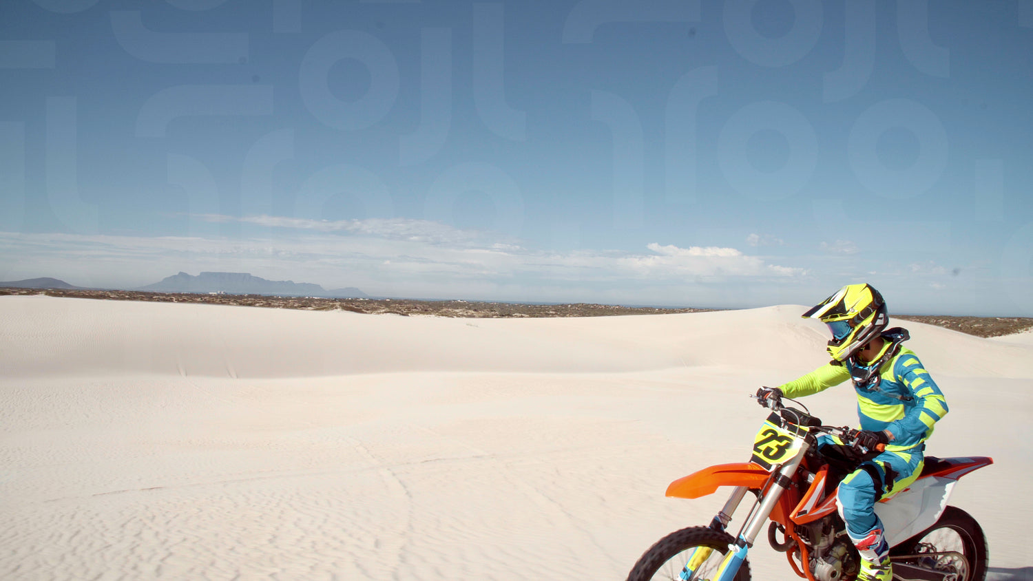 Motocross rider speeding his dirt bike over sand dunes. Young motorcyclist riding a cross country motorbike in a desert.