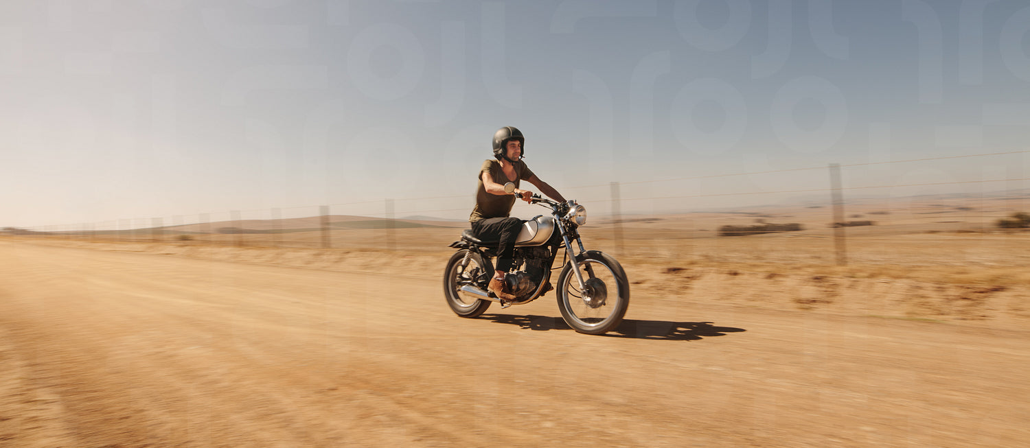 Young man riding motorbike off-road. Man riding on a motorcycle on rural road.