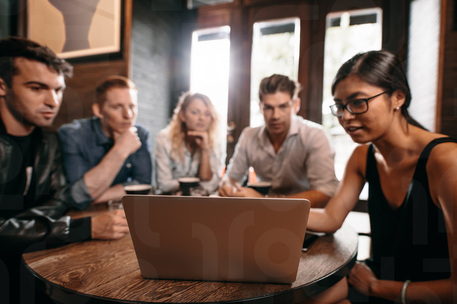 Group of friends sitting around cafe table and looking at laptop. Young men and women at coffee shop using laptop computer.