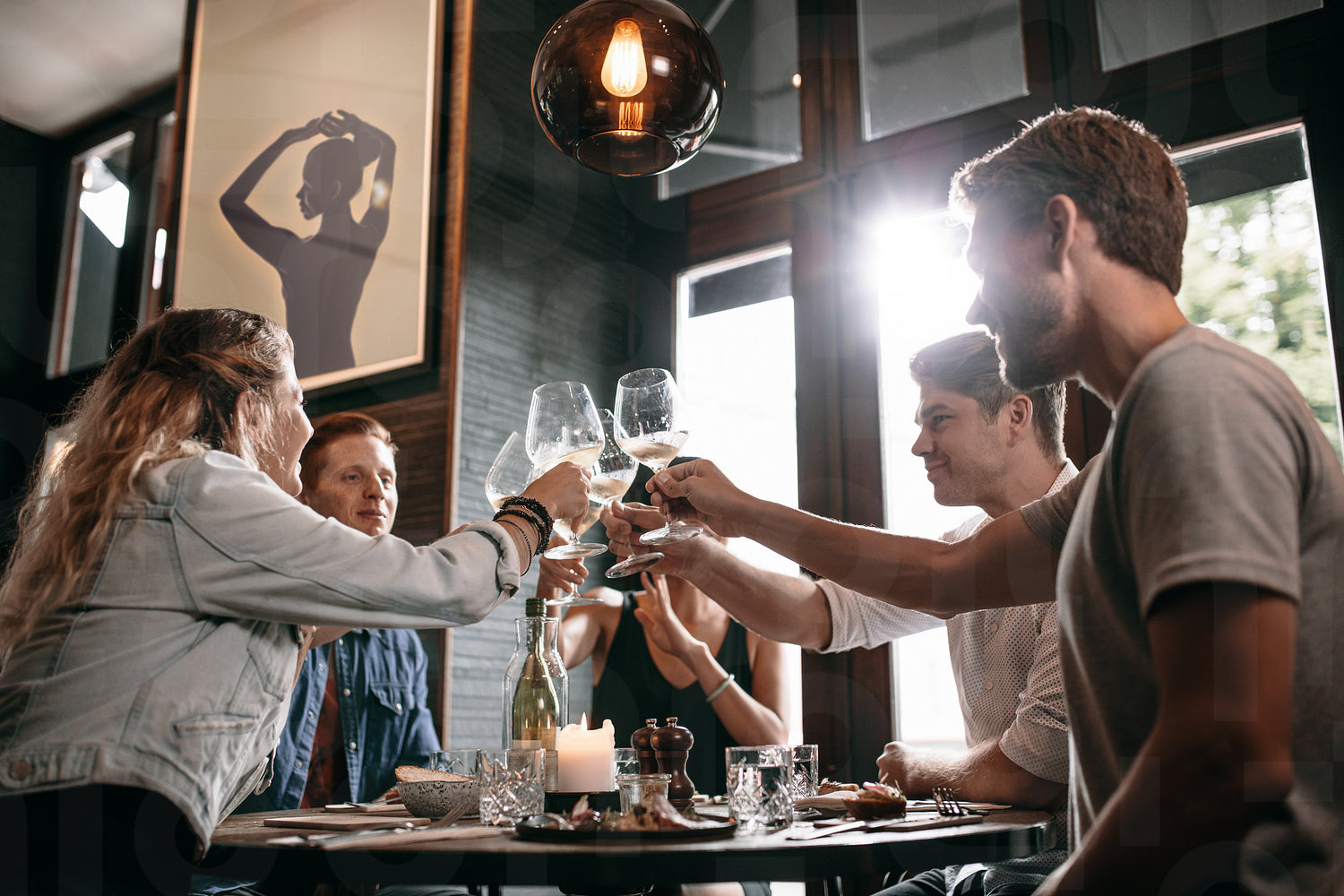 Young man and woman sitting at table and toasting drinks at restaurant. Group of friends toasting wine at cafe.