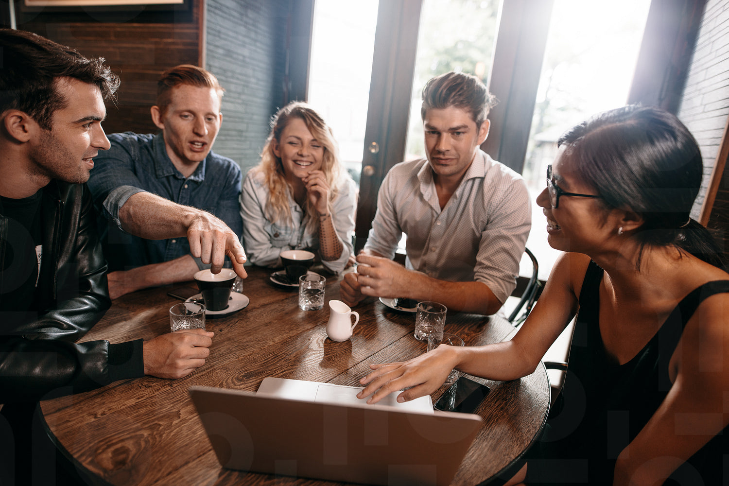 Group of young friends sitting at cafe with laptop and discussing. Young men and women looking at laptop at coffee shop.