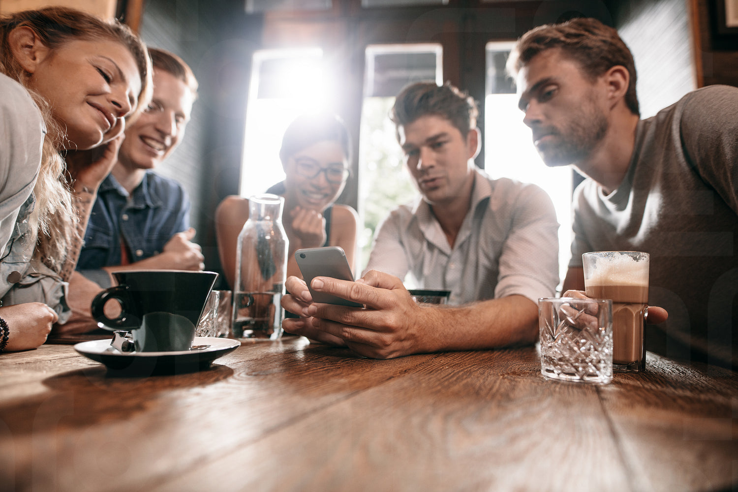 Group of friends at the cafe and looking at smart phone. Man showing something to his friends sitting by.