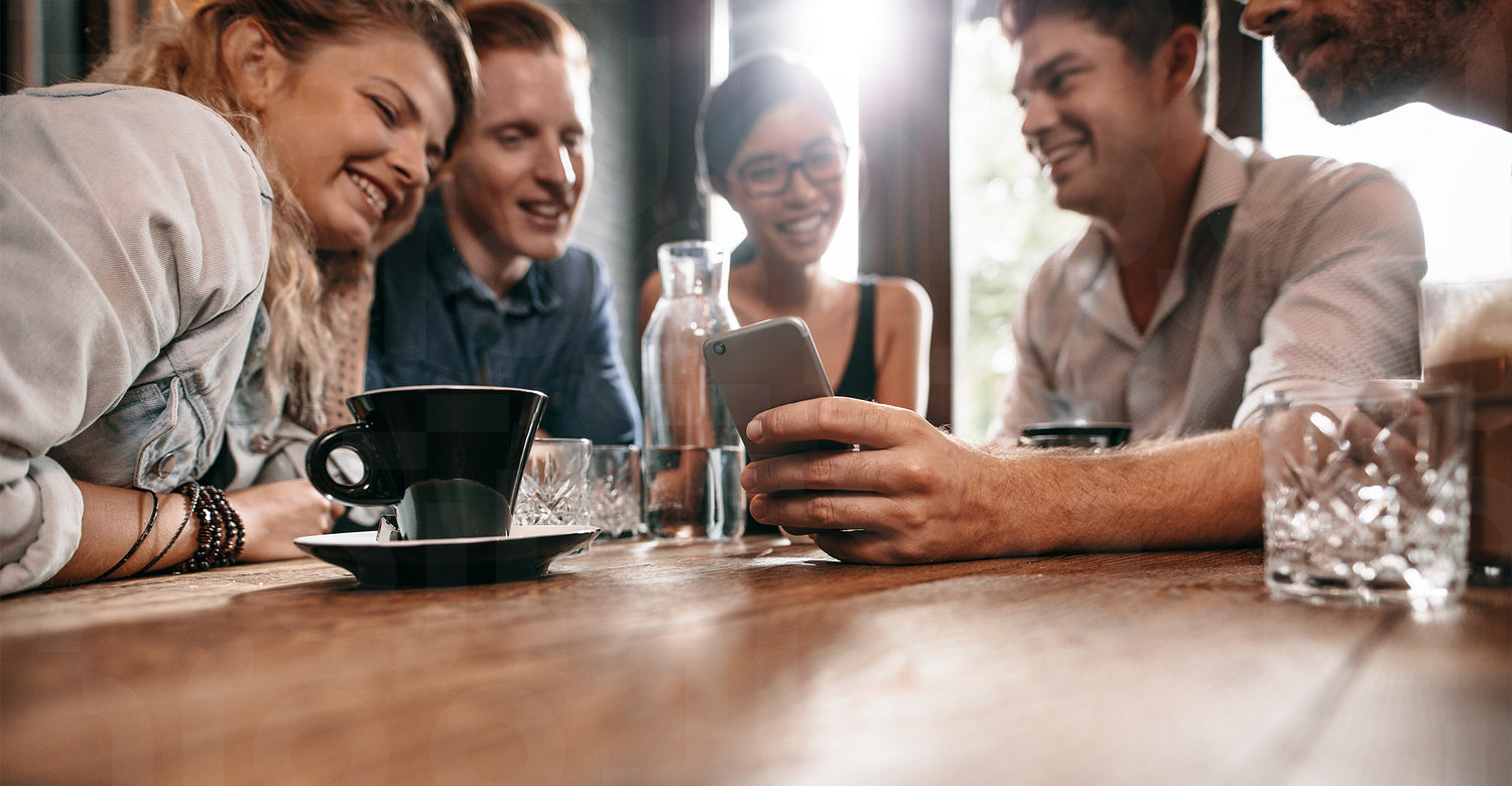 Horizontal shot of young friends watching photos on mobile phone. Group of young people sitting at cafe table and looking at smart phone.