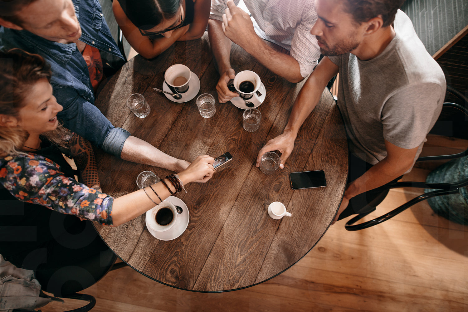 Top view of young people sitting around a cafe table and looking at mobile phone. Young men and women looking at pictures on smart phone.