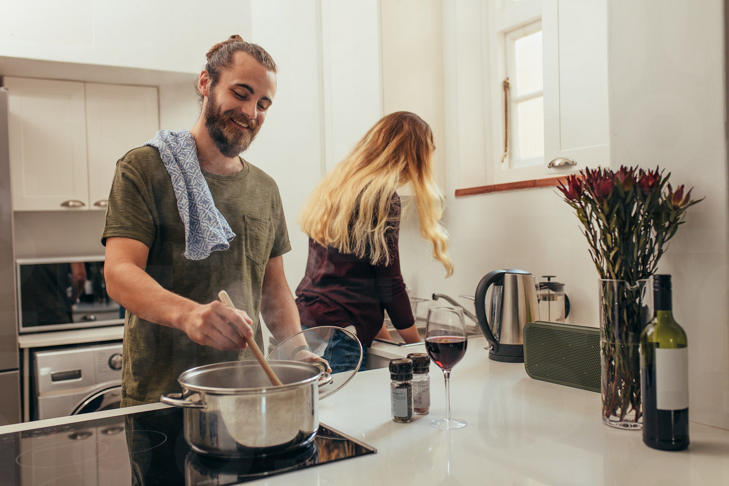 Happy man cooking food while woman washing dishes in kitchen. Couple sharing work at home.
