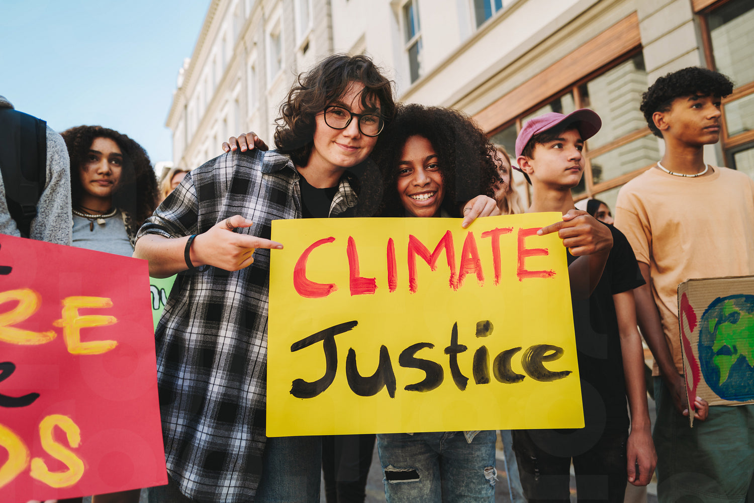 Happy teenage girls holding a poster at a climate change march. Group of multicultural youth activists protesting against global warming. Diverse young people joining the global climate strike.