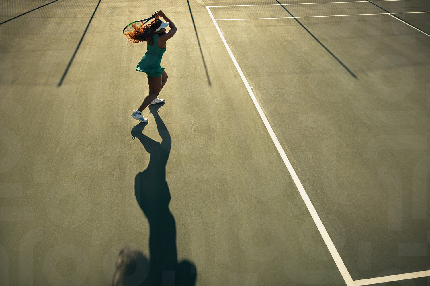 Female tennis player practicing on an outdoor court, casting long shadows