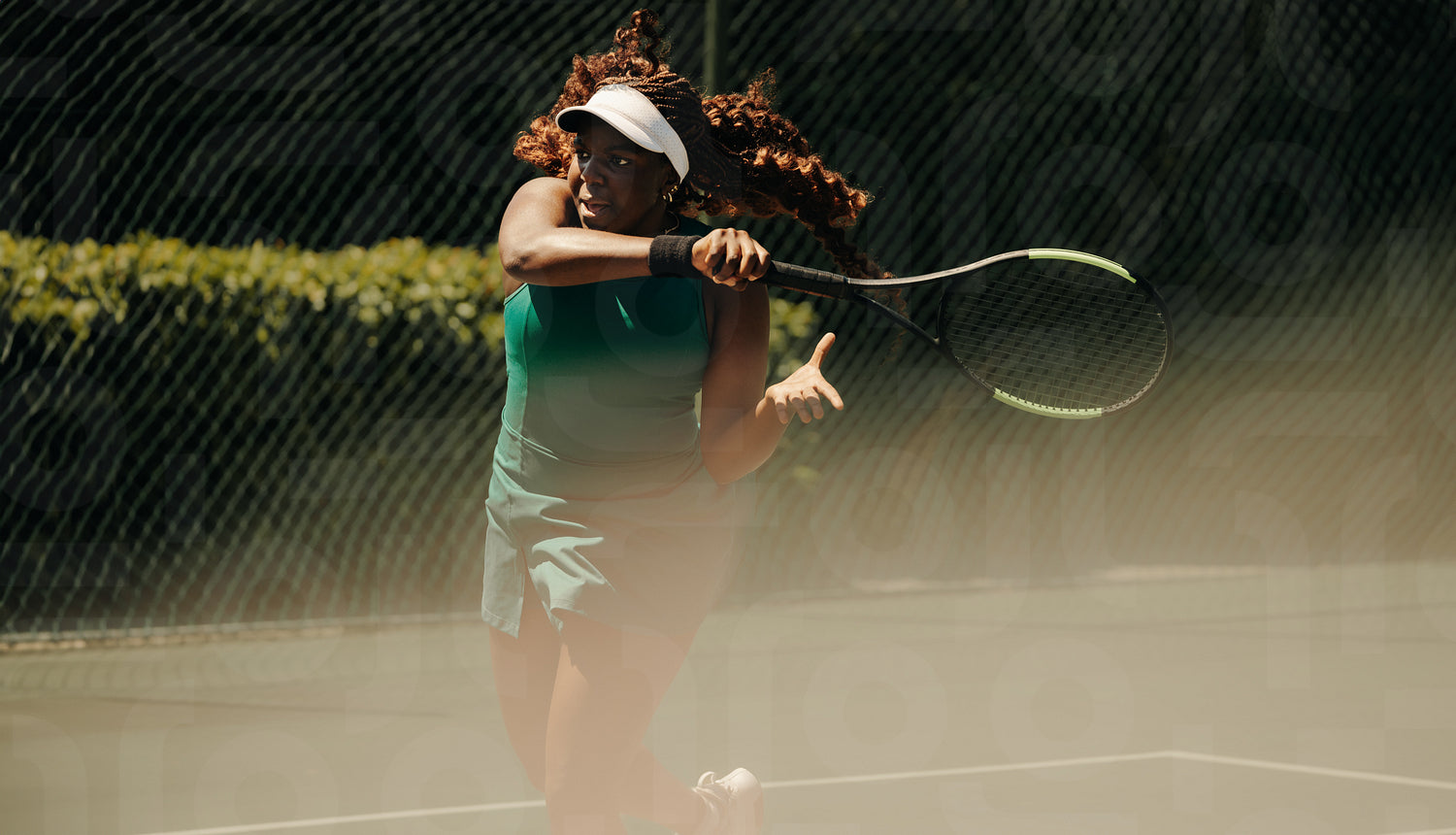 Focused sportswoman swinging racket while playing tennis on an outdoor court, with a hedge background in a sunny day.