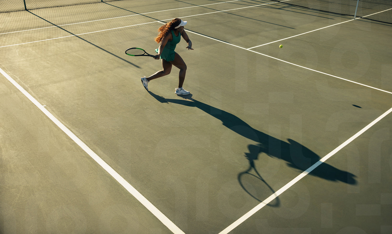 Woman playing tennis at sunset, swinging racket and casting shadow