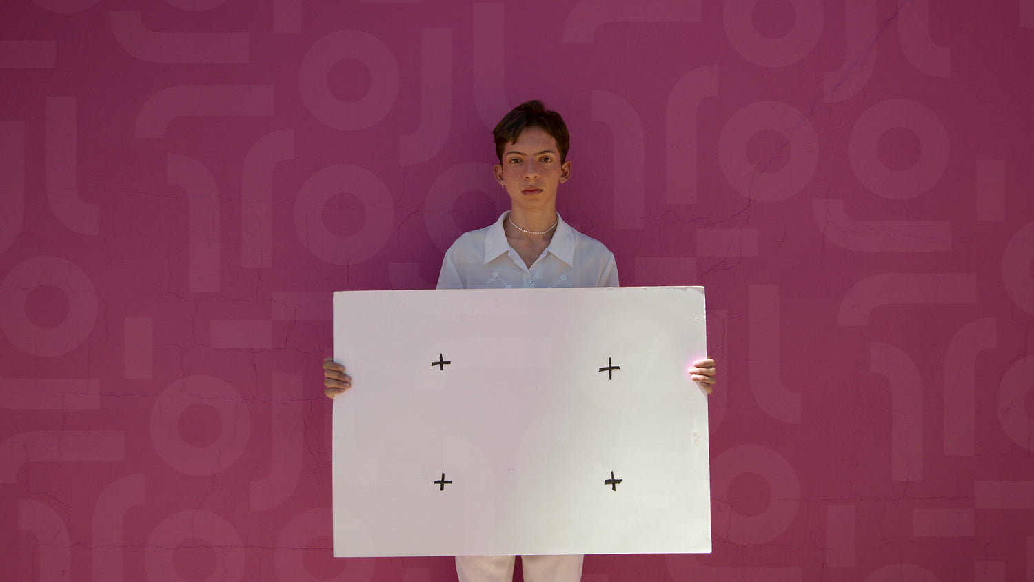 Gender fluid person with blank billboard. Gay person holding empty sheet looking at camera while standing against pink background.