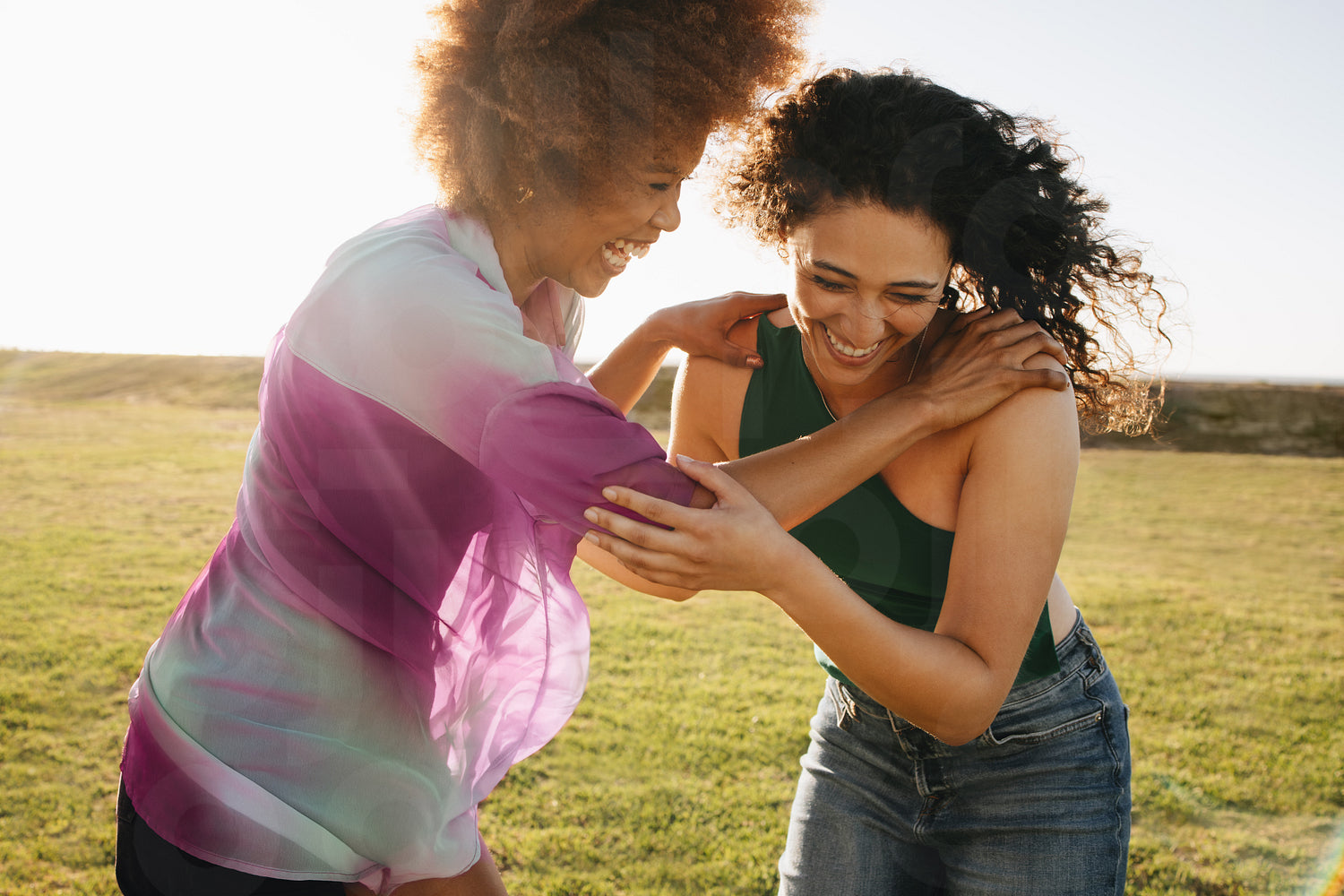 Best friends laughing and enjoying the outdoors, showcasing fashion and lifestyle