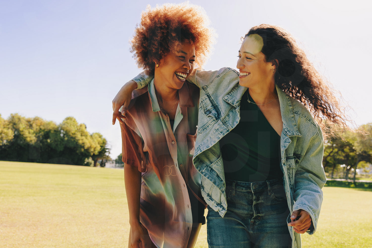 Two young girlfriends in casual attire enjoy a sunny day in the park, laughing and embracing, capturing the essence of friendship and happiness.