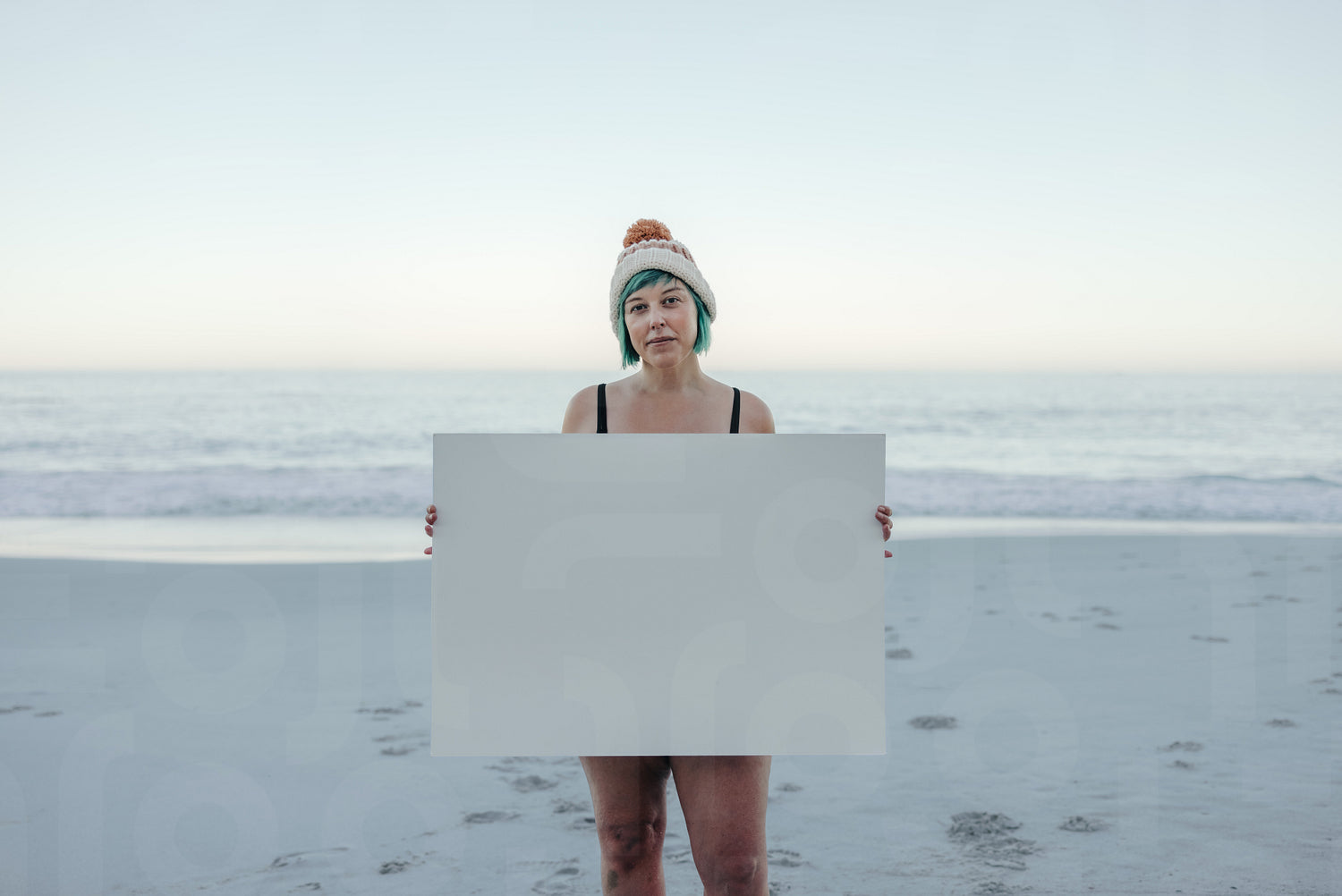 Confident winter looking at the camera while holding a white placard at the beach. Female activist displaying a blank banner. Middle aged woman standing by the sea in swimwear.