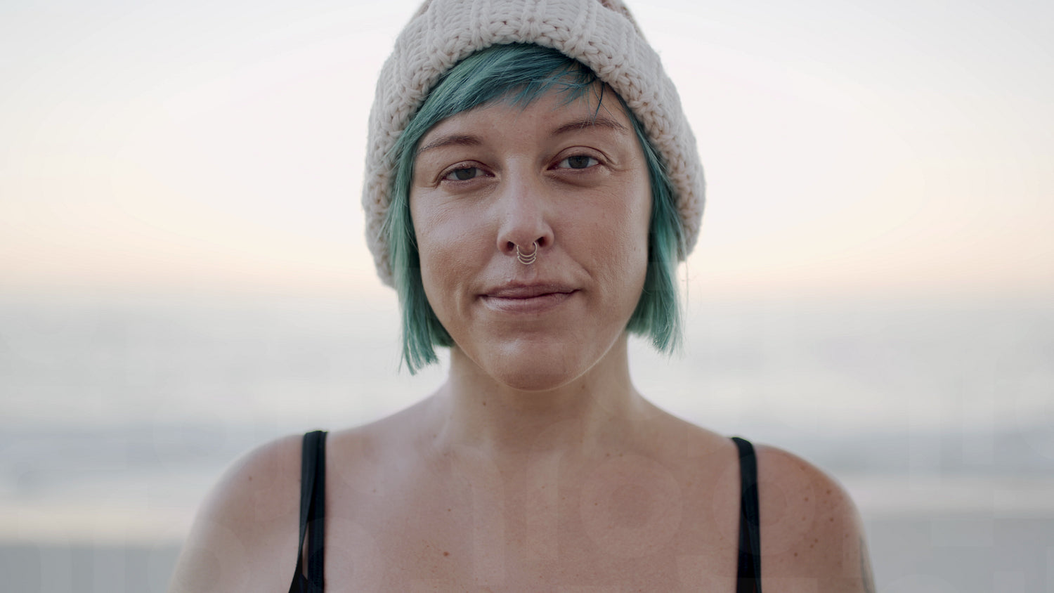 Portrait of cheerful woman on the beach. Close-up of a happy female wearing knitted hat and smiling on the seashore during sunset.