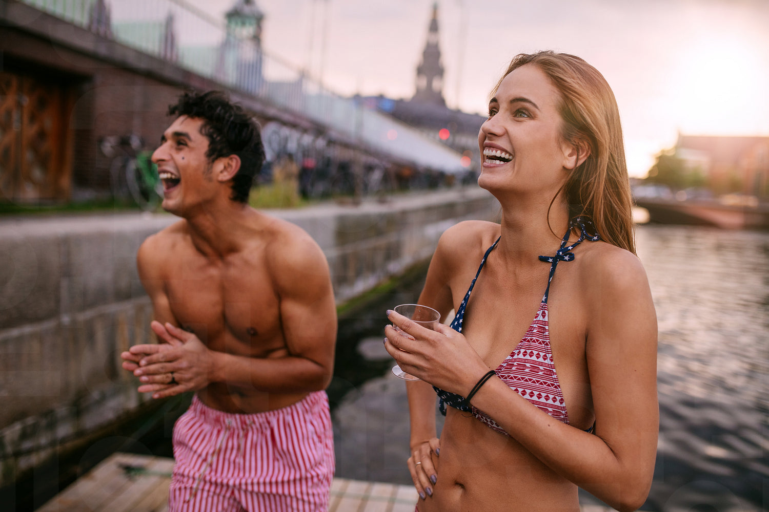 Beautiful young girl in bikini with friend by the lake. Young people having fun on a summer day at the lake.