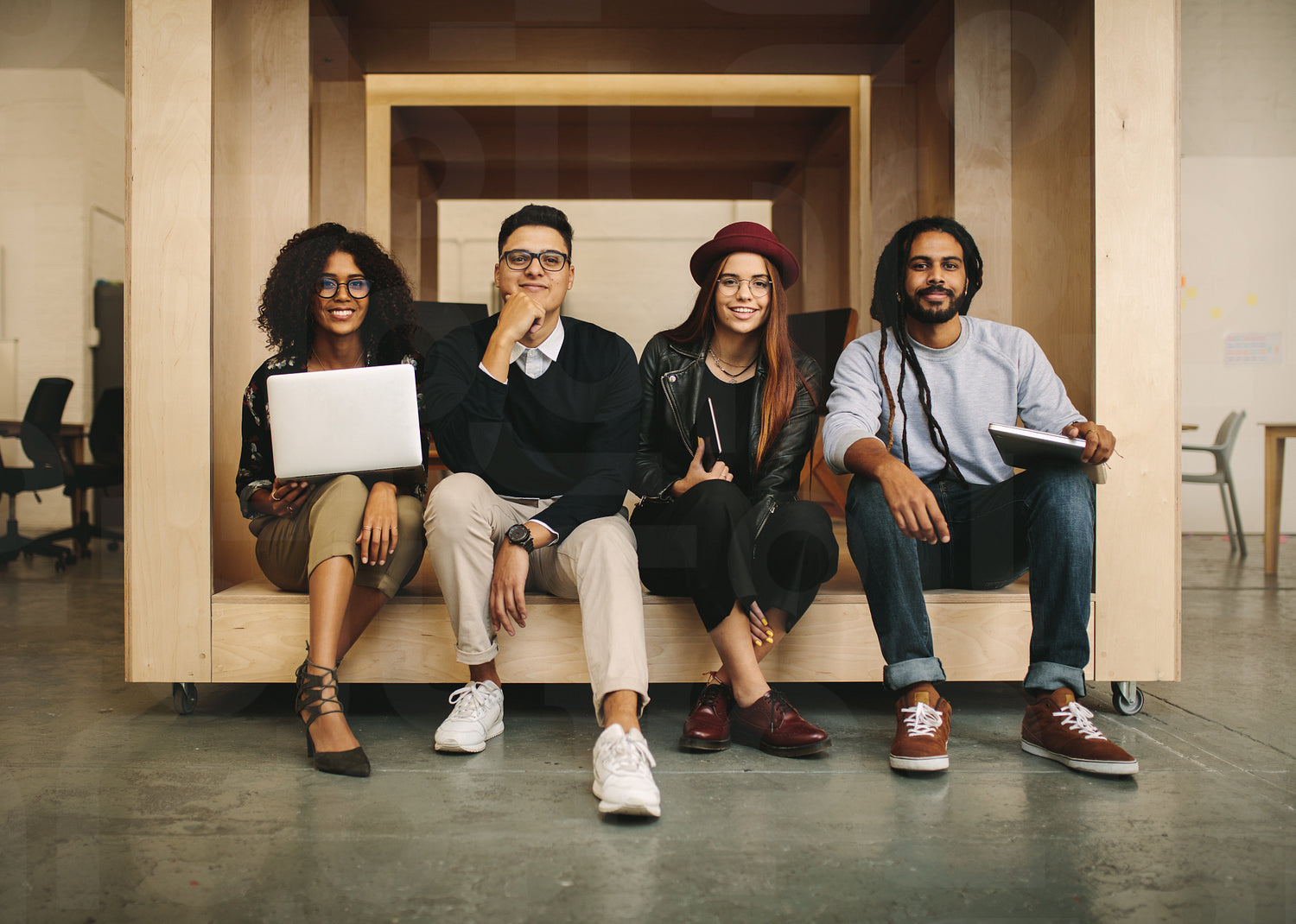 Creative business partners in office sitting in a cube enclosure together with laptops. Portrait of entrepreneurs sitting in office with laptops.