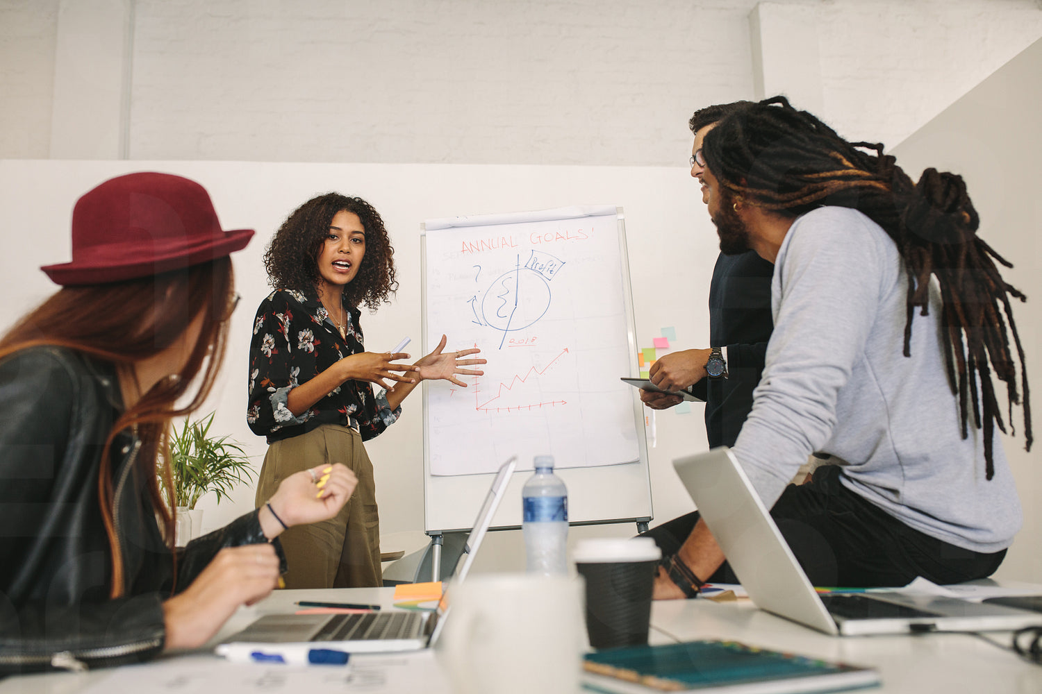 Woman entrepreneur explaining ideas and plans to colleagues on a flip chart board in office. Business partners in a meeting using laptops and digital tablets along with traditional flip chat board.