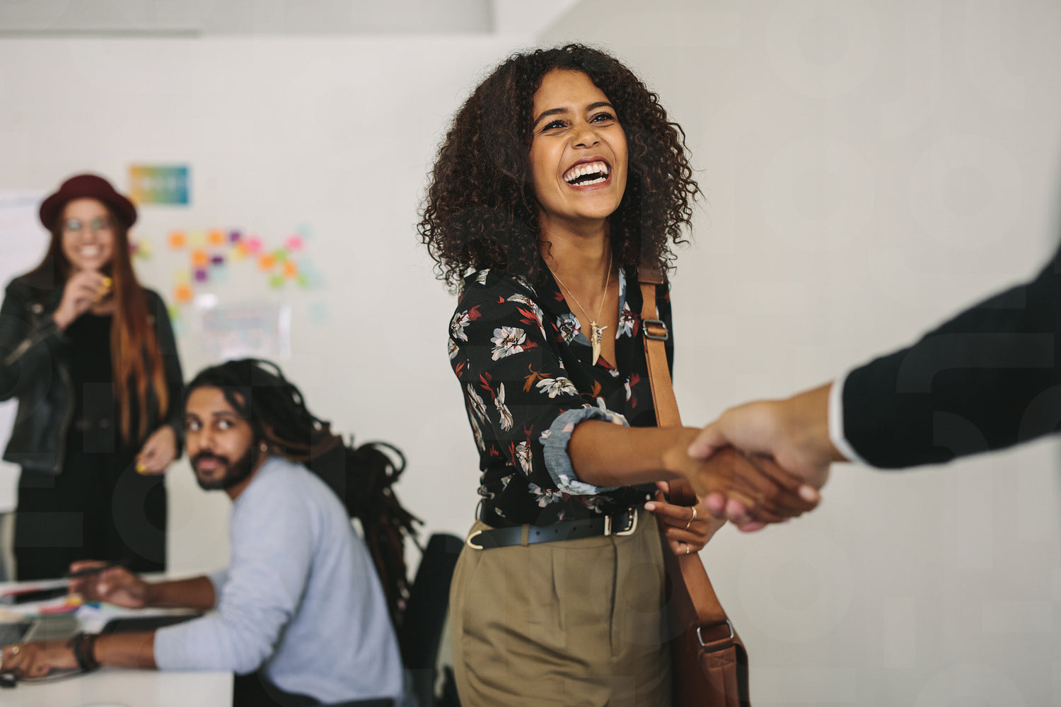 Happy business professional wearing office bag shaking hands with client. Business partners in a meeting while a businesswoman greets a customer.