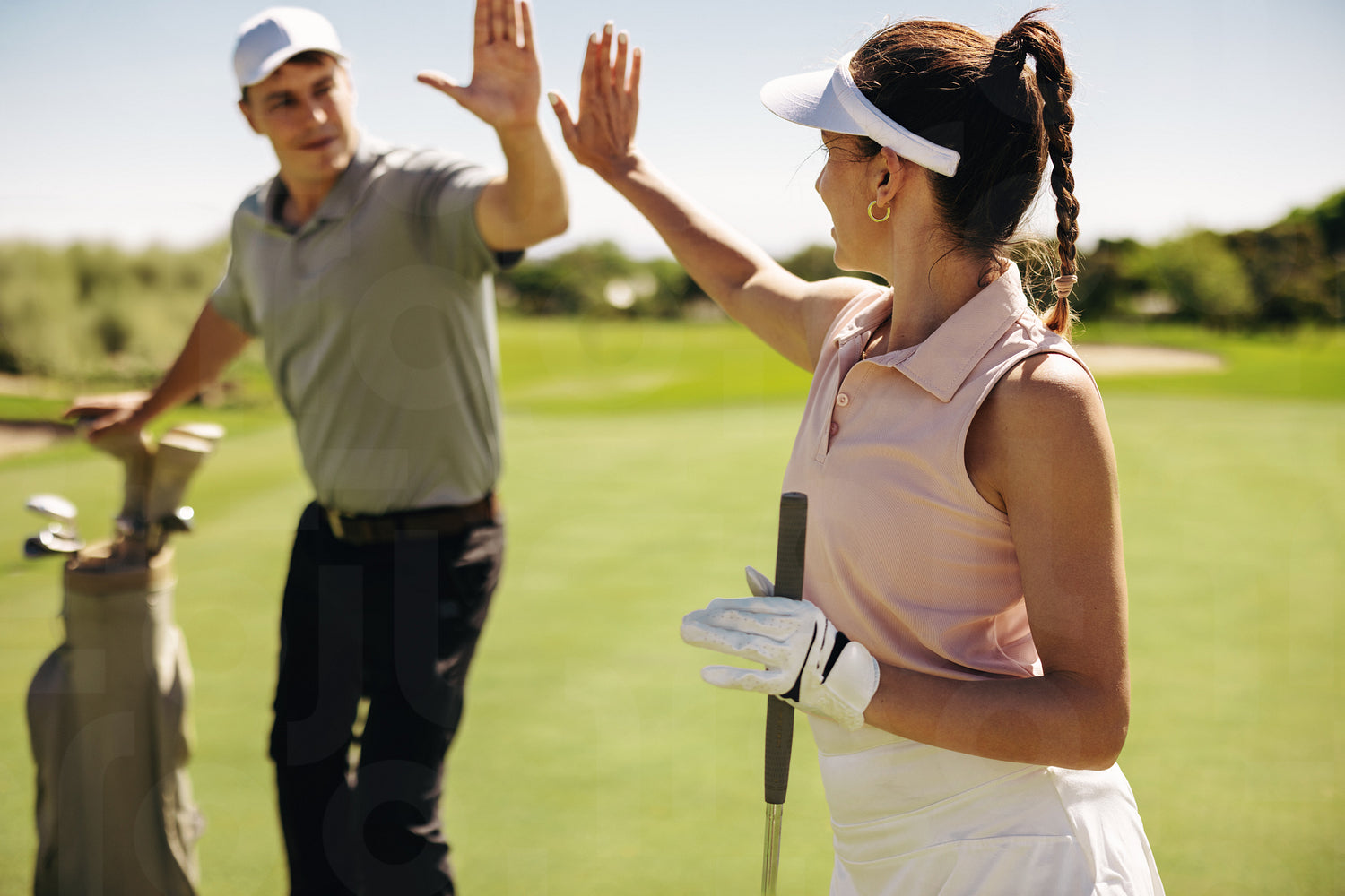 Sportsman and sportswoman sharing a high five on the golf course wearing golfing attire