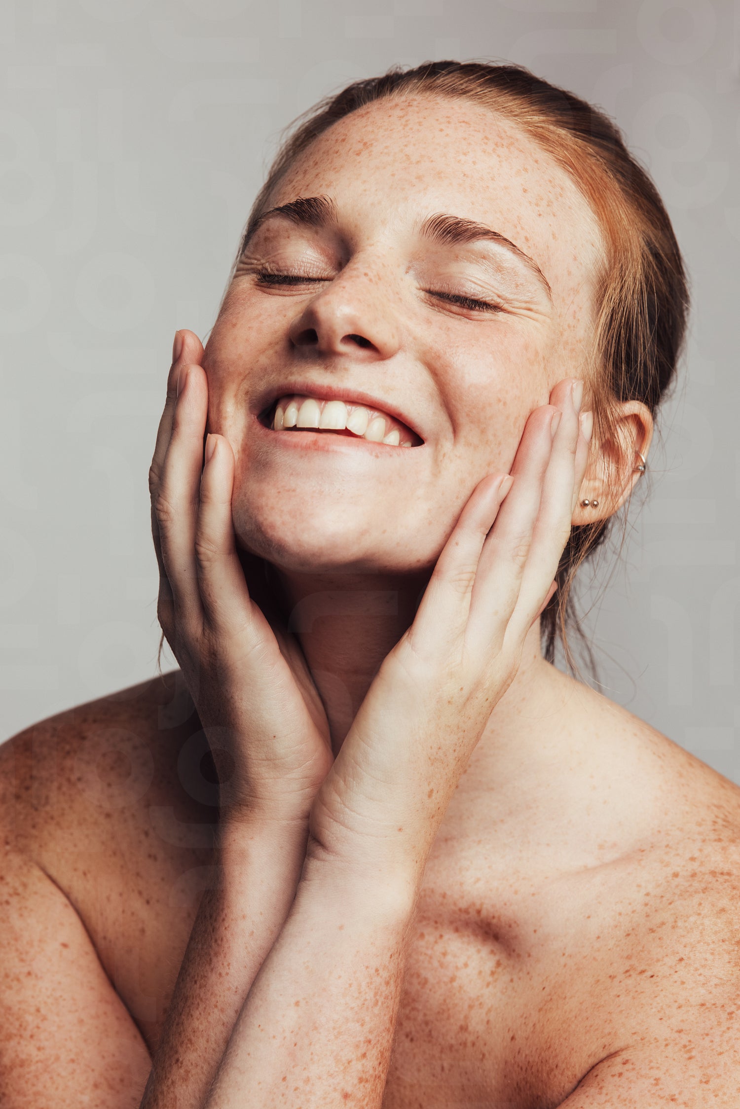 Portrait of happy woman with freckles on body. Close up of smiling woman with hands on face with closed eyes.