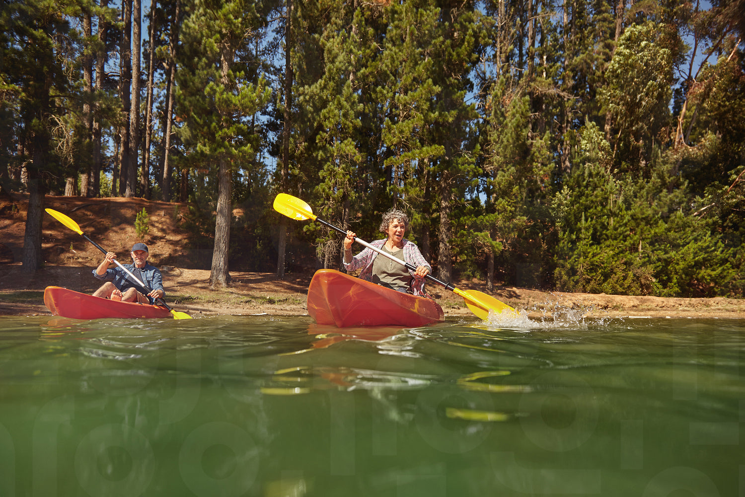 Portrait of a mature couple canoeing on a lake during a camping trip. Active senior couple in two single kayaks in the lake.