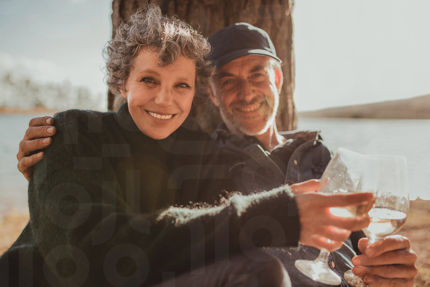 Portrait of loving mature couple sitting together with a glass of wine. Man and woman camping near a lake on a summer day.