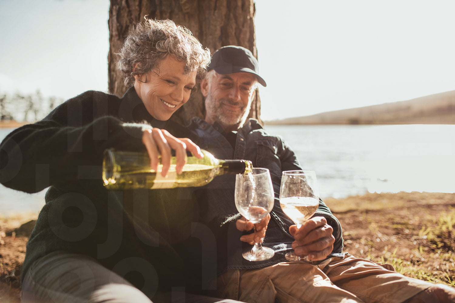 Senior couple enjoying drinks at campsite near Lake. Mature woman pouring wine in glasses, both sitting under a tree on a summer day.