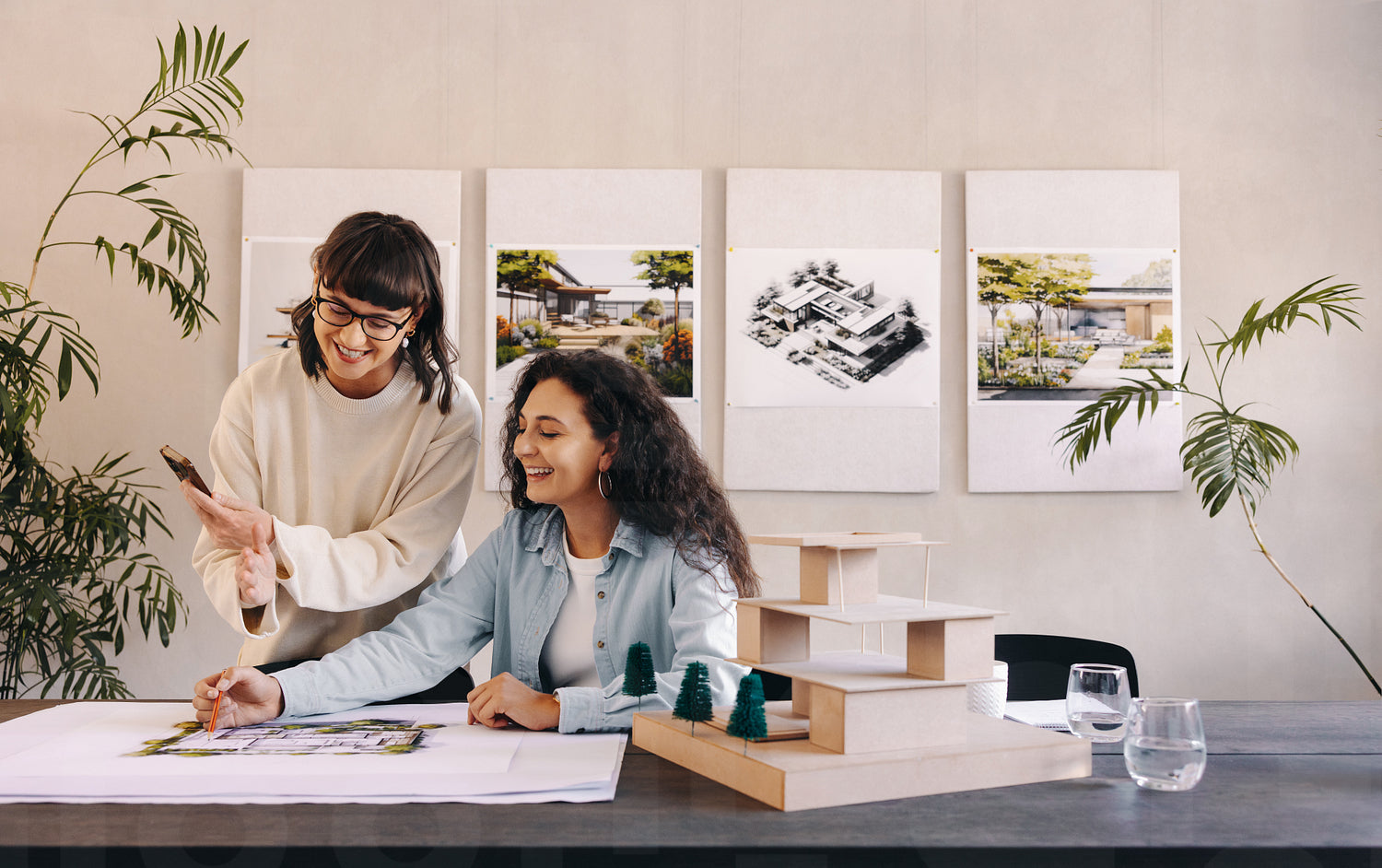 Two architects discussing a project while working on a building model in a creative studio. The workspace emphasizes planning and creativity, featuring architectural drawings on walls.