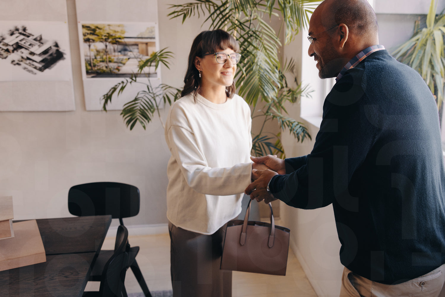 A business meeting where two individuals engage in a friendly handshake, symbolizing trust and successful collaboration, set in a modern office space with design and greenery in the background.