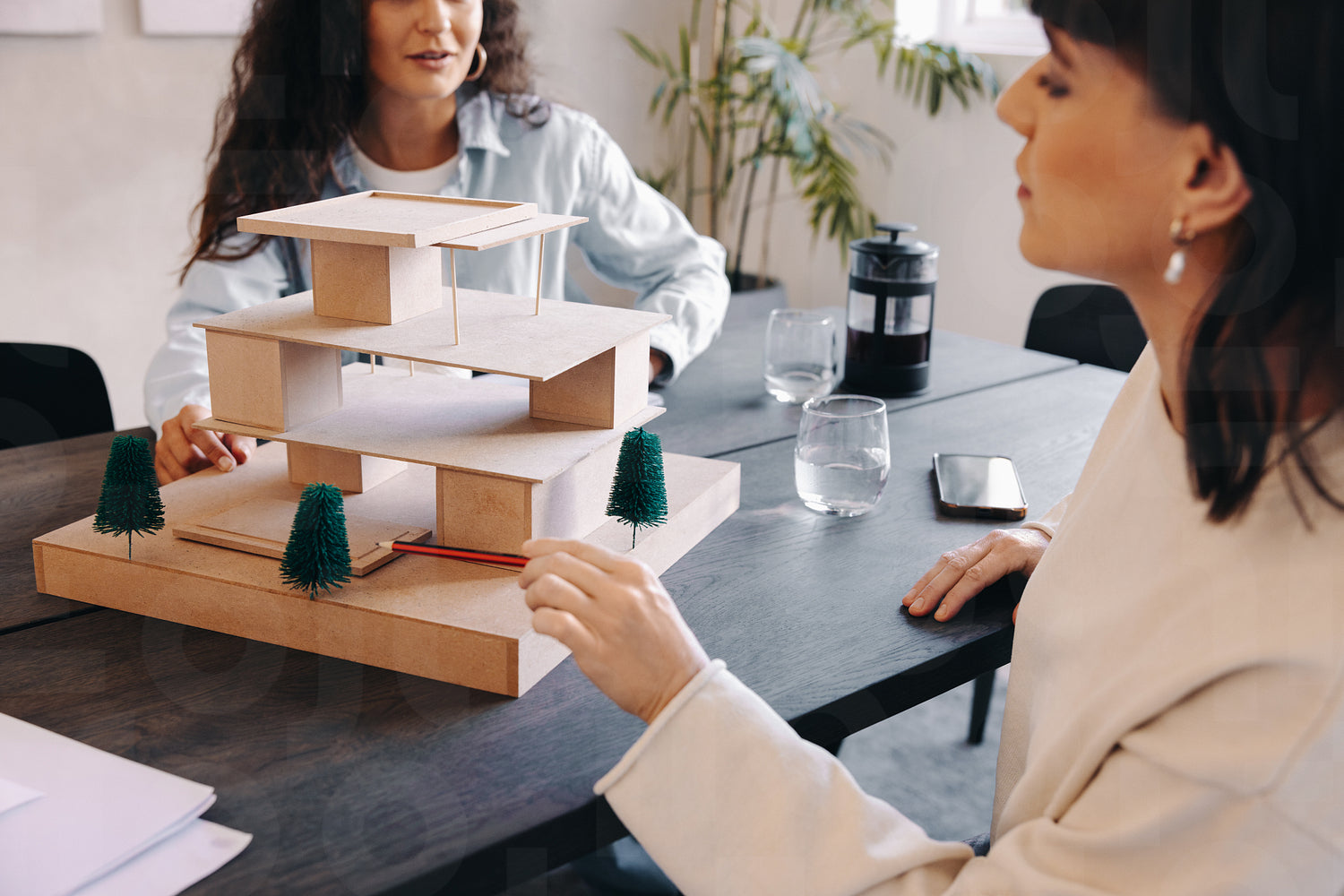 Two colleagues inspect a building model structure during a collaborative meeting, suggesting a creative team effort.