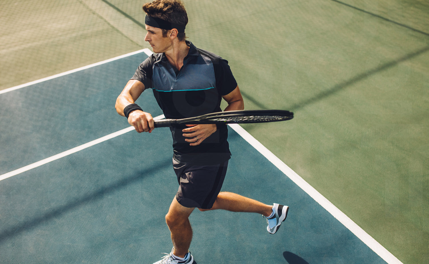 Pro tennis player practicing forehands on a club hard court. Young male tennis player playing on a club tennis court.