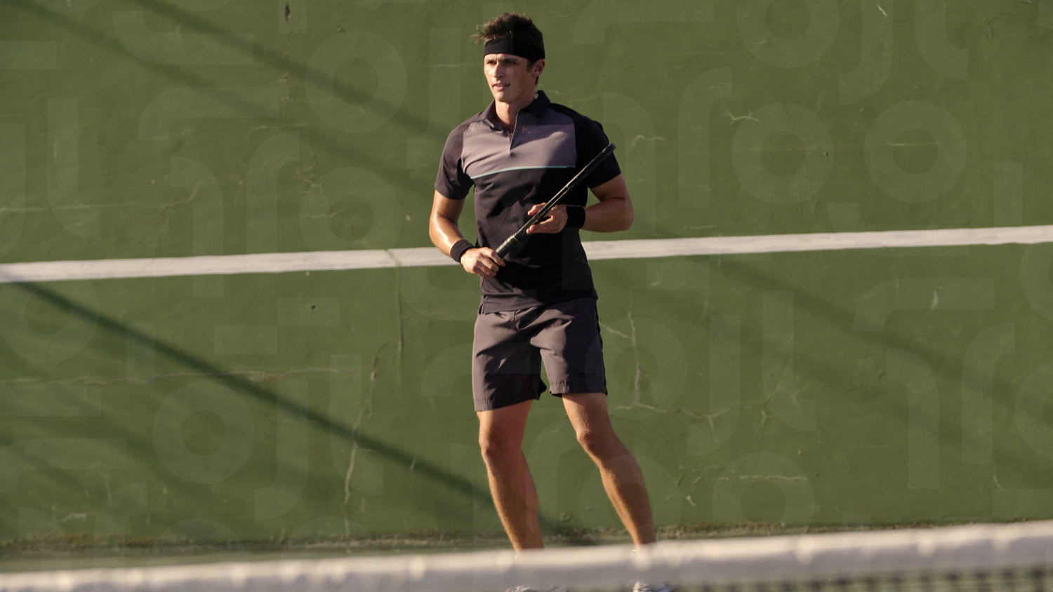 Professional tennis player hitting forehands on hard court. Man in sportswear playing a game of tennis on hard court.