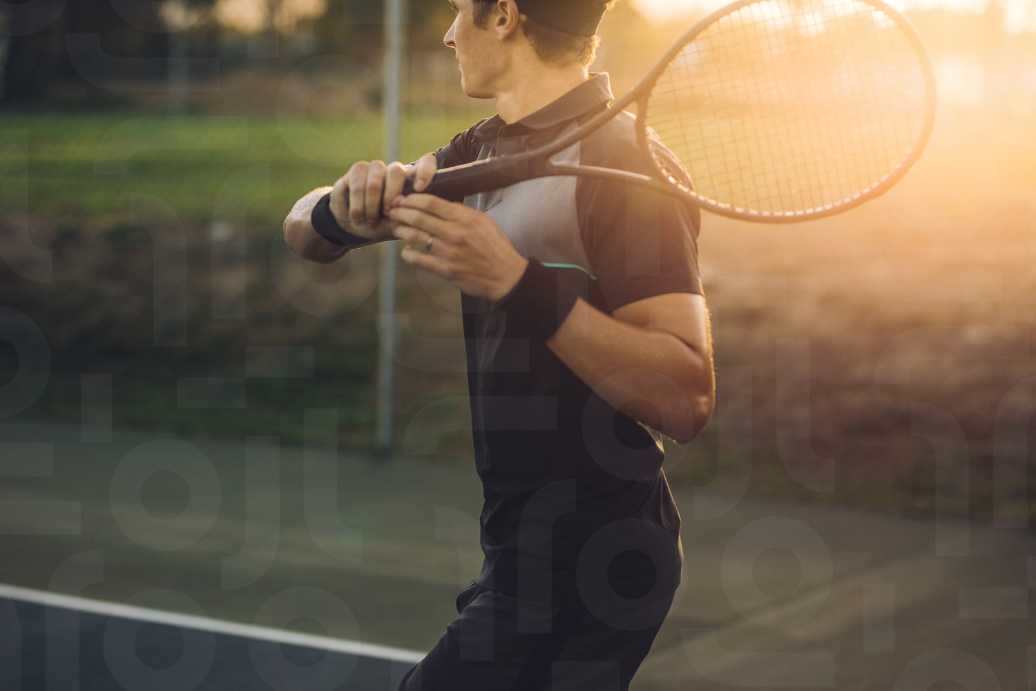 Young male tennis player returning the serve with a forehand. Tennis player playing on club hard court.
