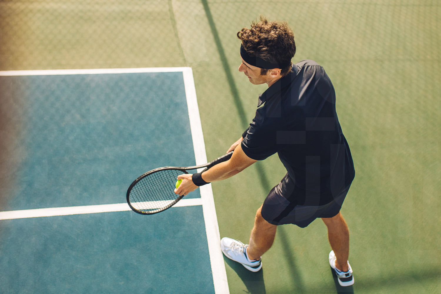 Top view of a young tennis player with racket ready to serve a tennis ball. Professional player standing at the baseline holding the tennis racket and the ball before starting the match on a hard court.