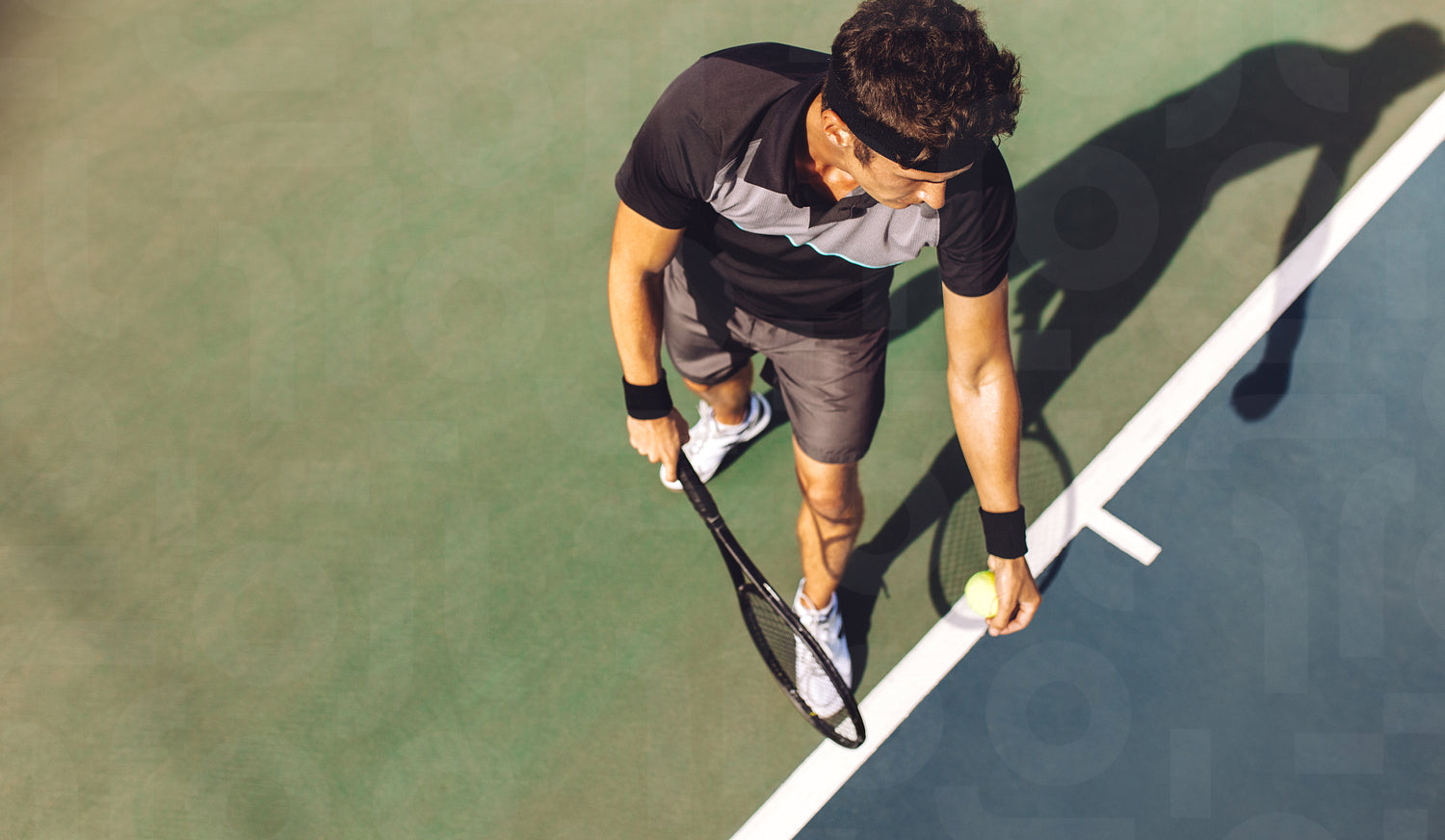 Top view of a young tennis player with racket ready to serve a tennis ball. Professional player standing at the baseline holding the tennis racket and the ball on a hard court.