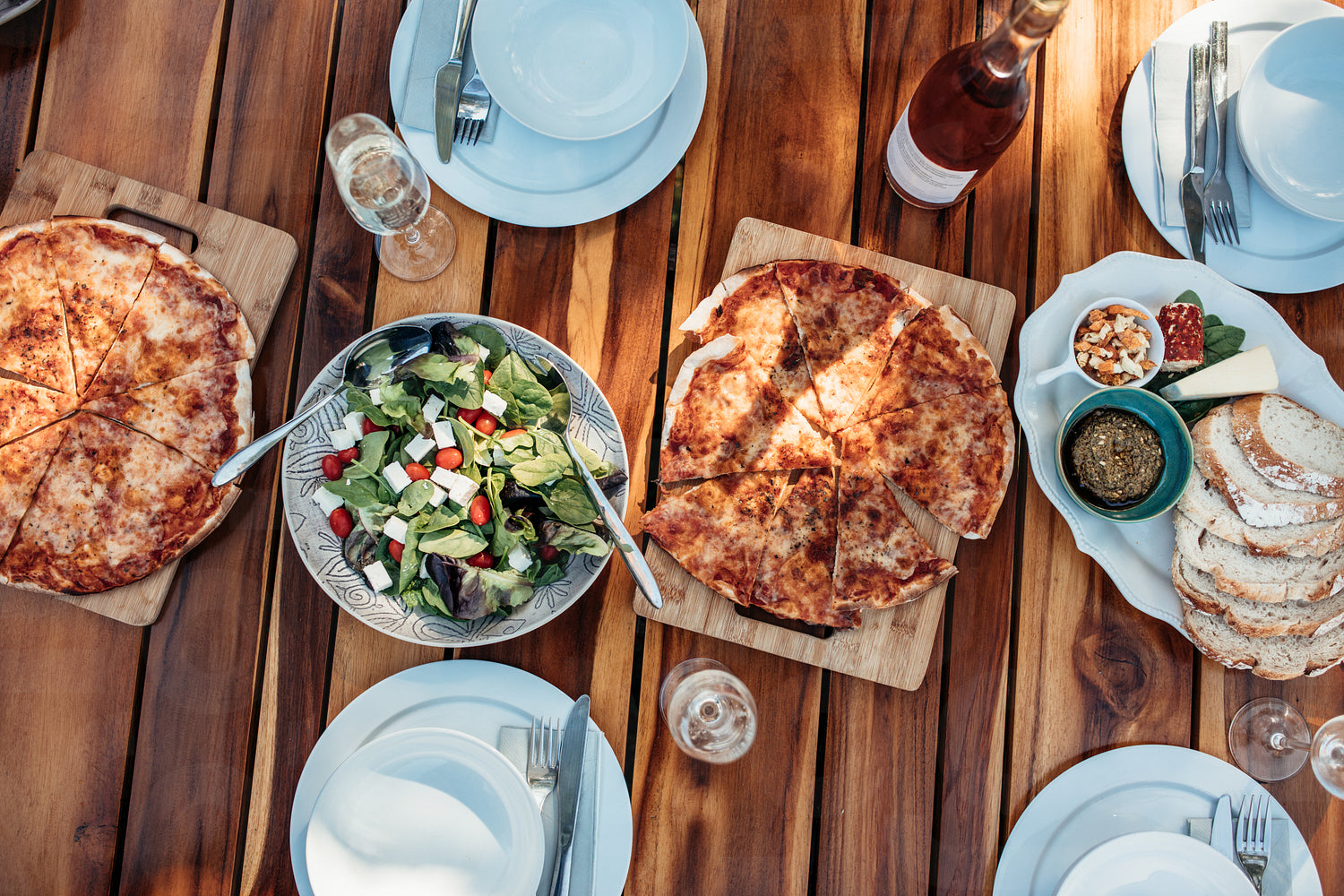Top view of food and drinks on wooden table for housewarming party. Table outdoors with delicious food and drink for dinner.