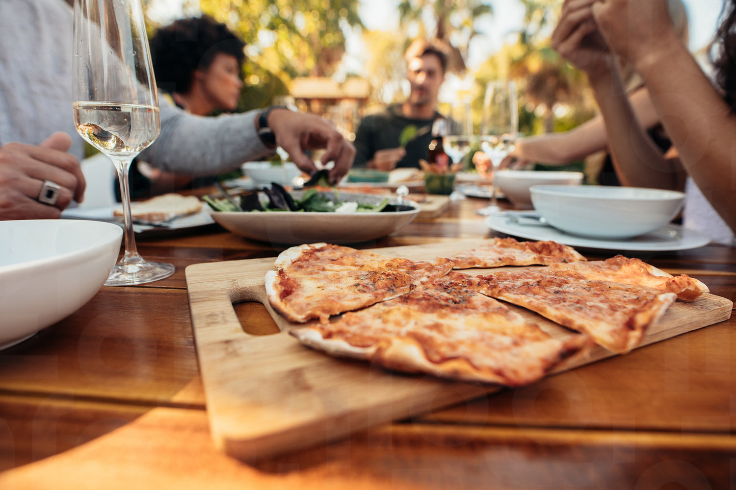 Delicious pizza on wooden table with people eating food. Friends having party outdoors.