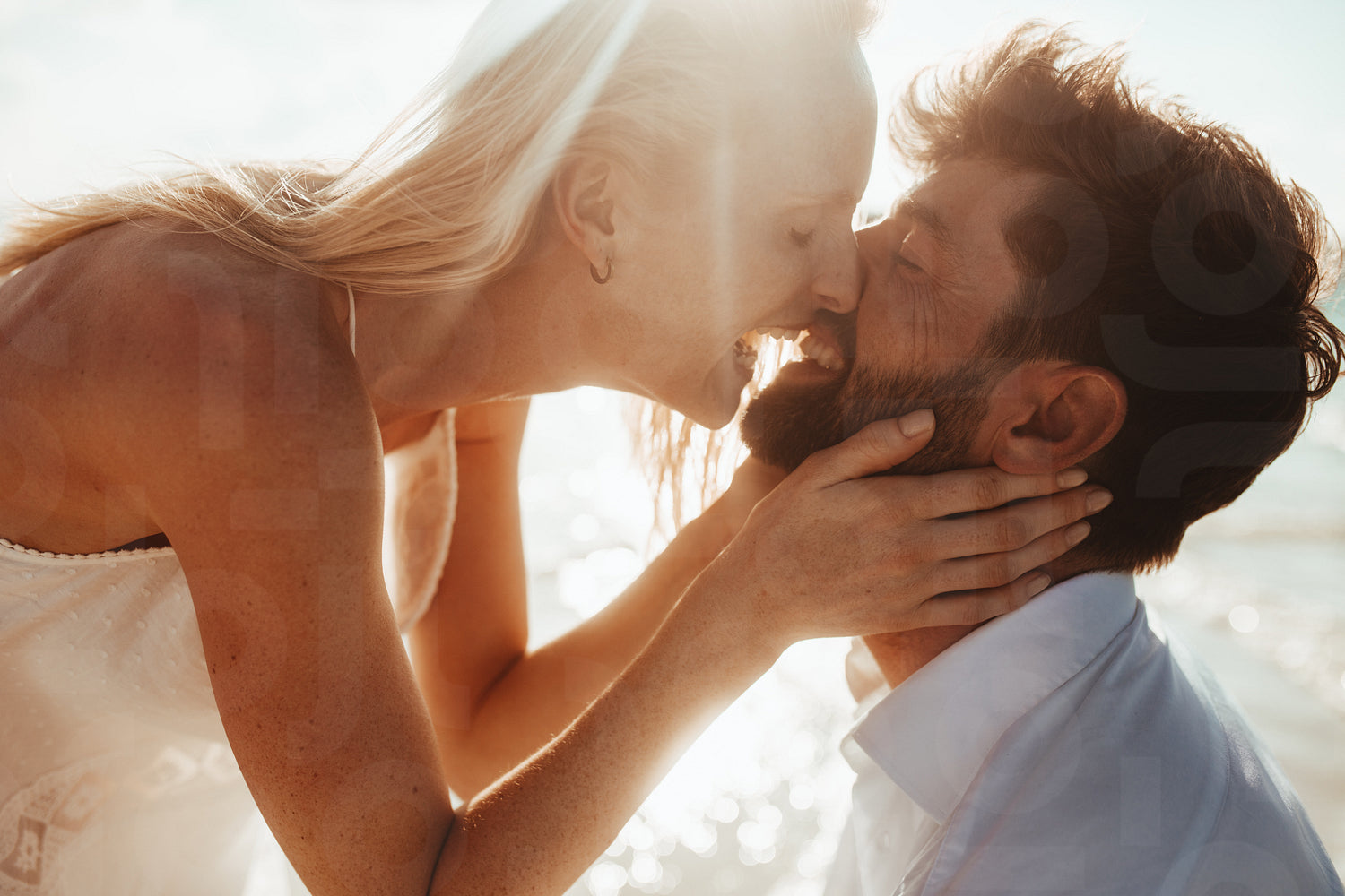 Close up of couple in love spending romantic moments outdoors. Happy woman kissing boyfriend holding his head on a sunny day.
